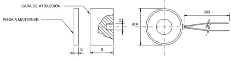 | Modelo tamaño | Medidas (mm) | Potencia P(W) | Factor de marcha E.D. | Fuerza de mantenimiento Fm(N) | Espesos de la pieza a mantener E(mm) | Peso (Kg) | ||